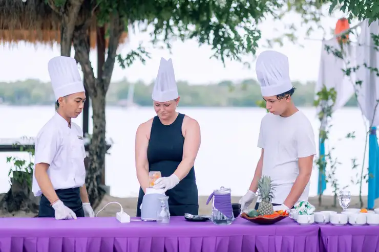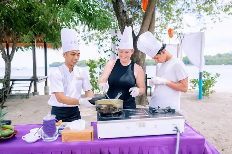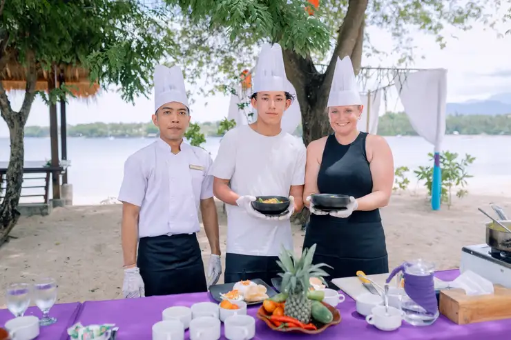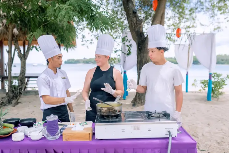 Discover the rich flavors of Indonesia in our immersive beachfront Cooking Class. Guided by our talented chef, you will learn to prepare one signature Indonesian main course using fresh local ingredients and traditional cooking techniques. Set in our beautiful open-air kitchen overlooking the ocean, this hands-on experience allows you to enjoy gentle sea breezes and stunning beach views while cooking. Perfect for beginners and food lovers, it’s a fun and memorable way to explore Indonesian cuisine.After the class, enjoy your freshly prepared dish accompanied by a complimentary special dessert from our chef and light snacks to complete your culinary journey.